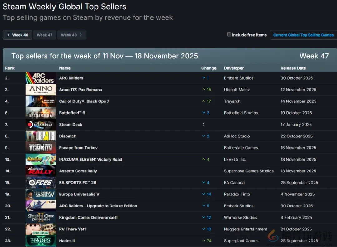 Steam新一周销量榜:《纪元117》上榜《黑色行动7》超越《战地6》